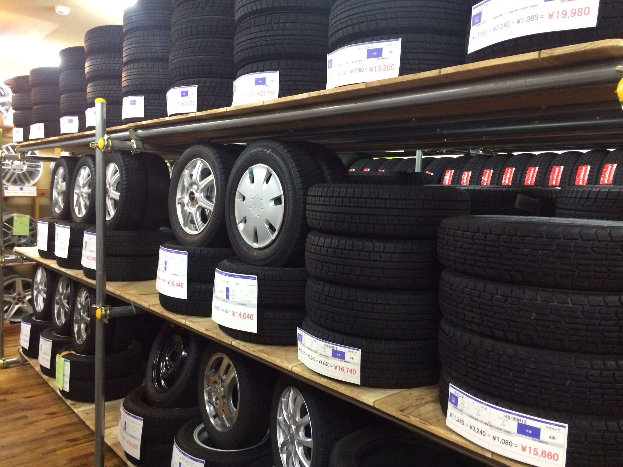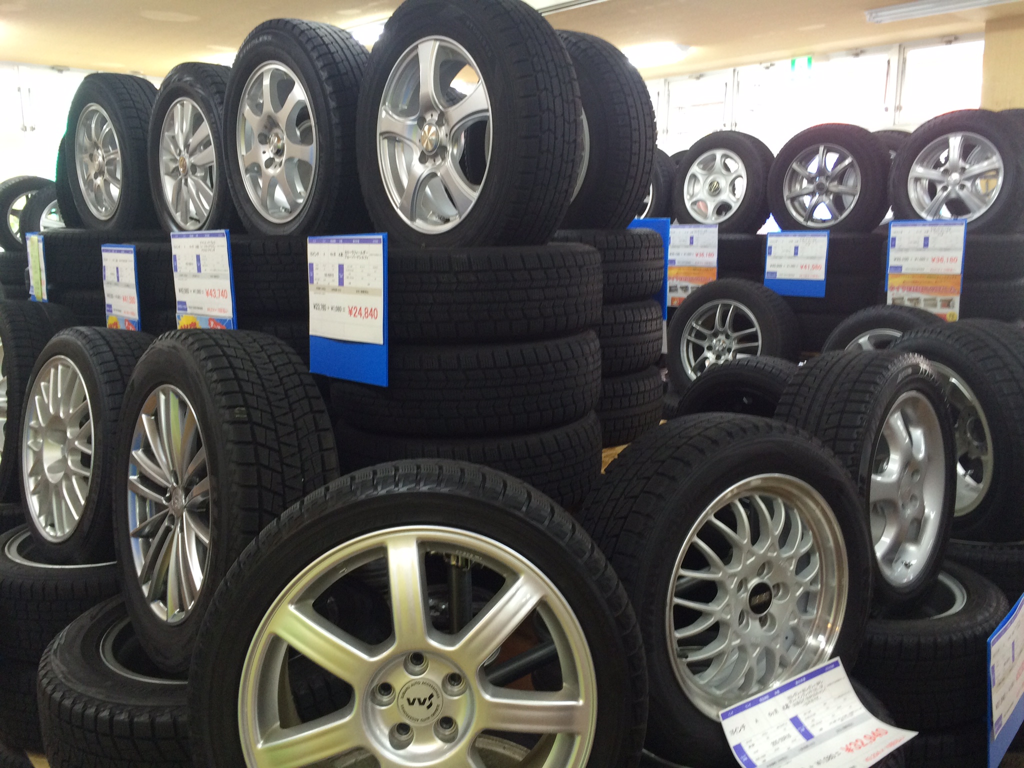 スタッドレスタイヤホイールセットの山がみえてきます。